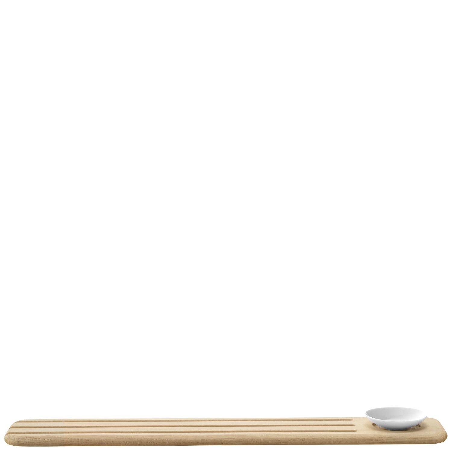 Designed for serving bread and condiments at the table, this large baguette board set is shaped from natural oak and includes a porcelain bowl for butter, olive oil or preserves. Each set is presented in photographic packaging.