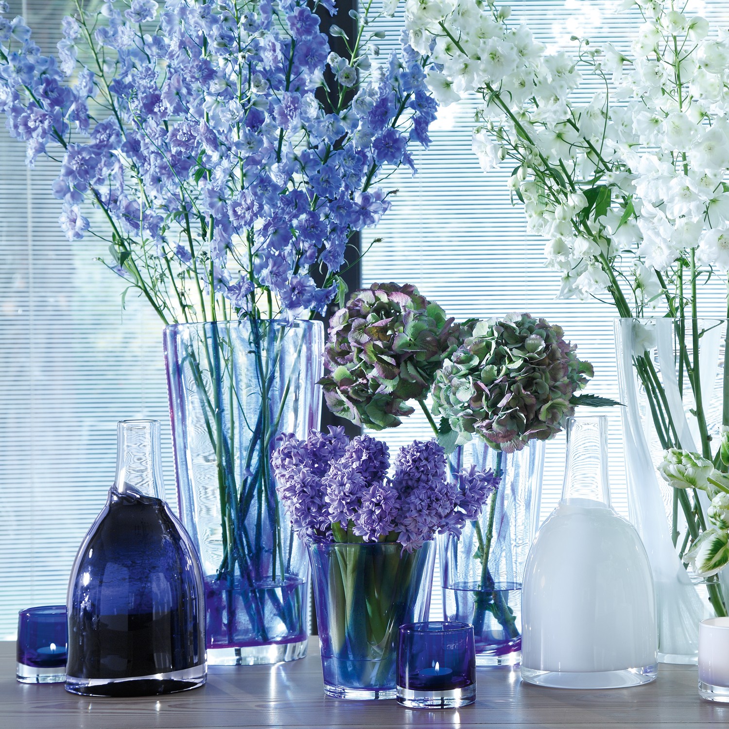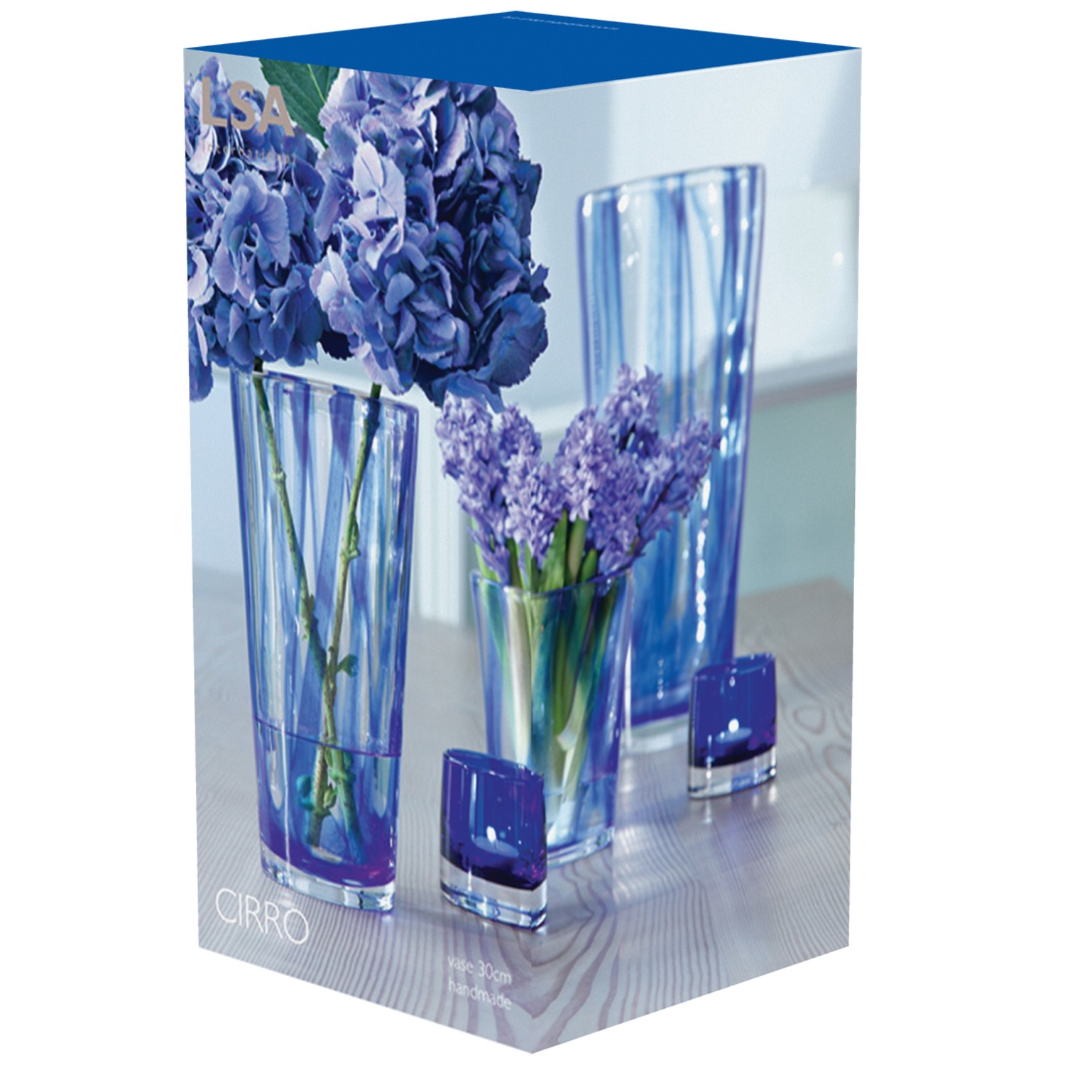 The cobalt blue décor expertly cased in the walls of this mouthblown vase enhances the full spectrum of floral colours, from whites through to rich reds and violets.