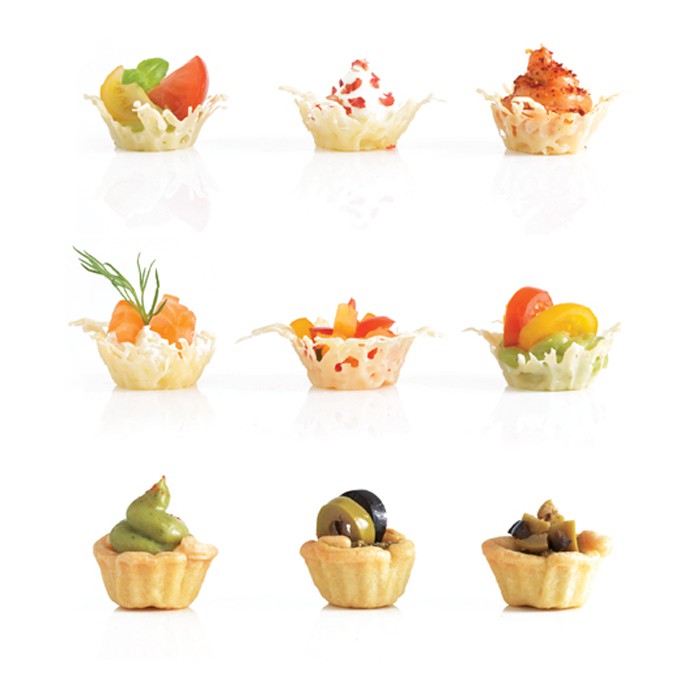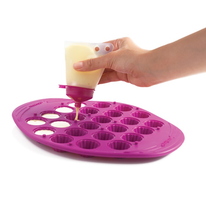 A flexible, nonstick 100% silicone mold with 24 baking cups and a lid.