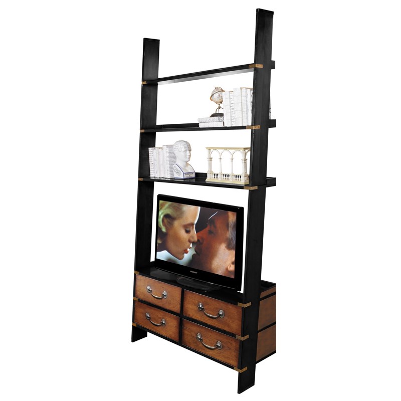 A wall cabinet that combines many functions. Its wall-leaning design makes it less bulky and more elegant to the critical eye. Which counts in smaller spaces, but still functions well in larger ones. Storage! Shelves for collectables and books! And the main purpose space for a 42 flat screen TV. Our brass bound multi-functional campaign cabinet is built to last generations. The gallery ladder cabinet arrives in two easily assembled sections.
