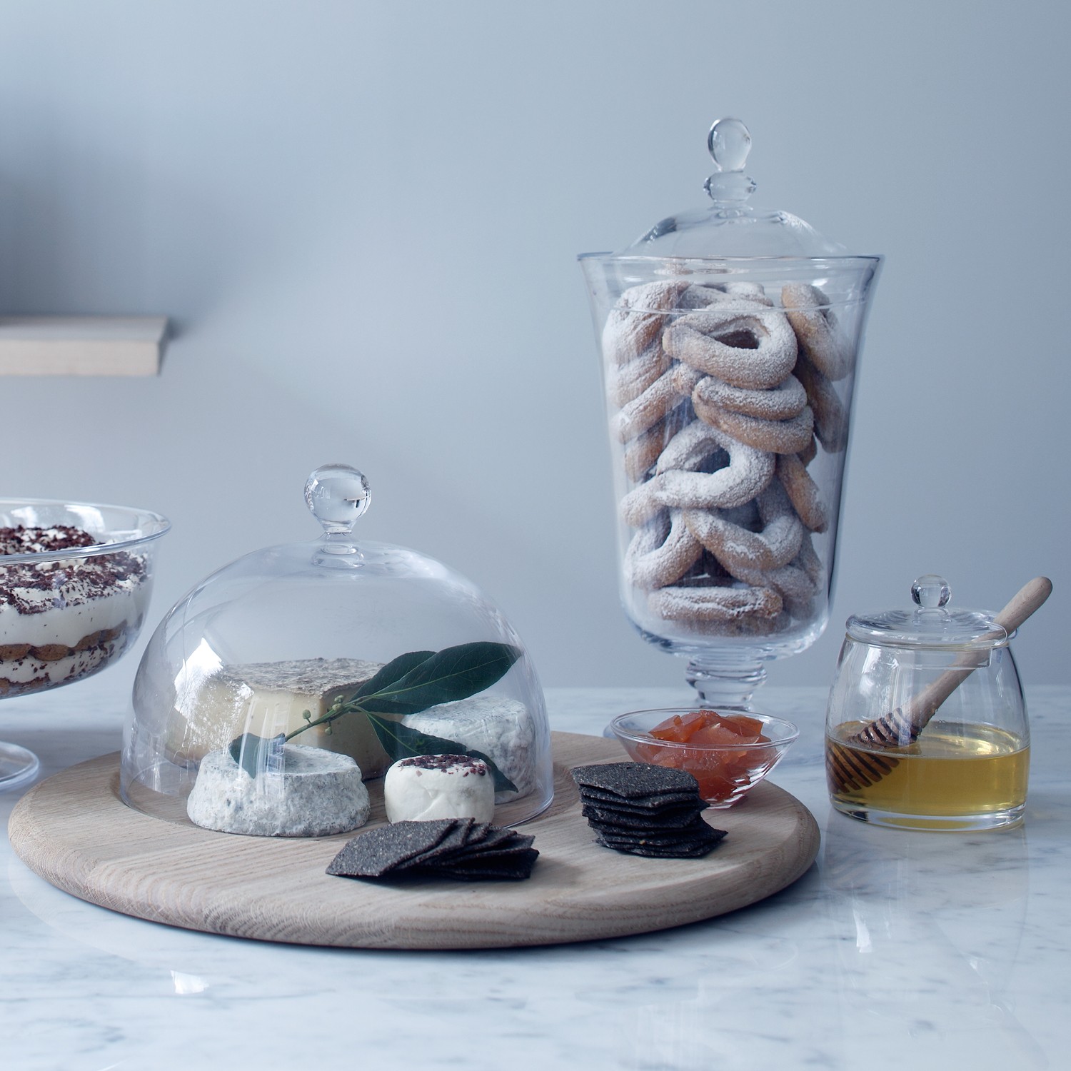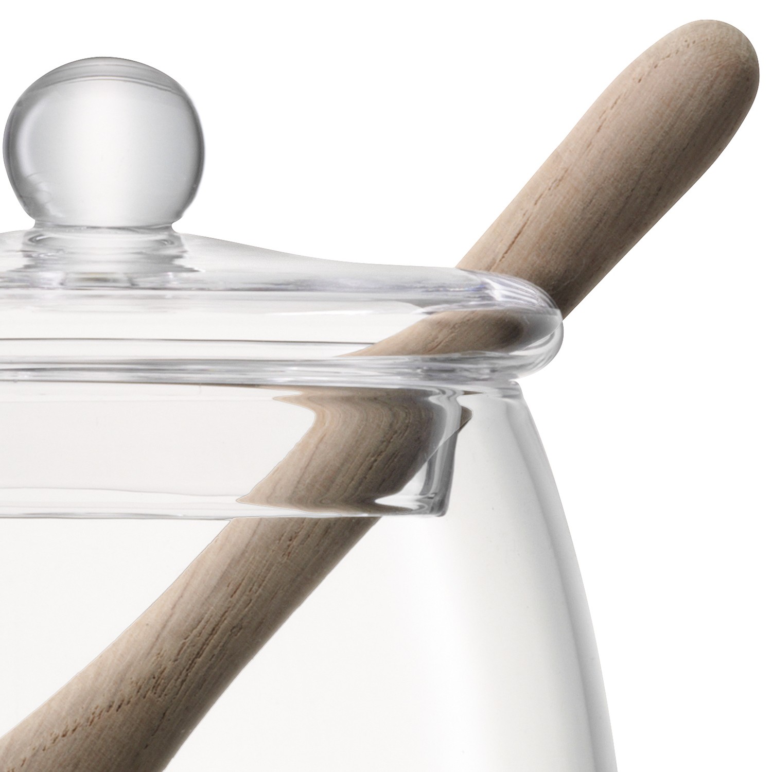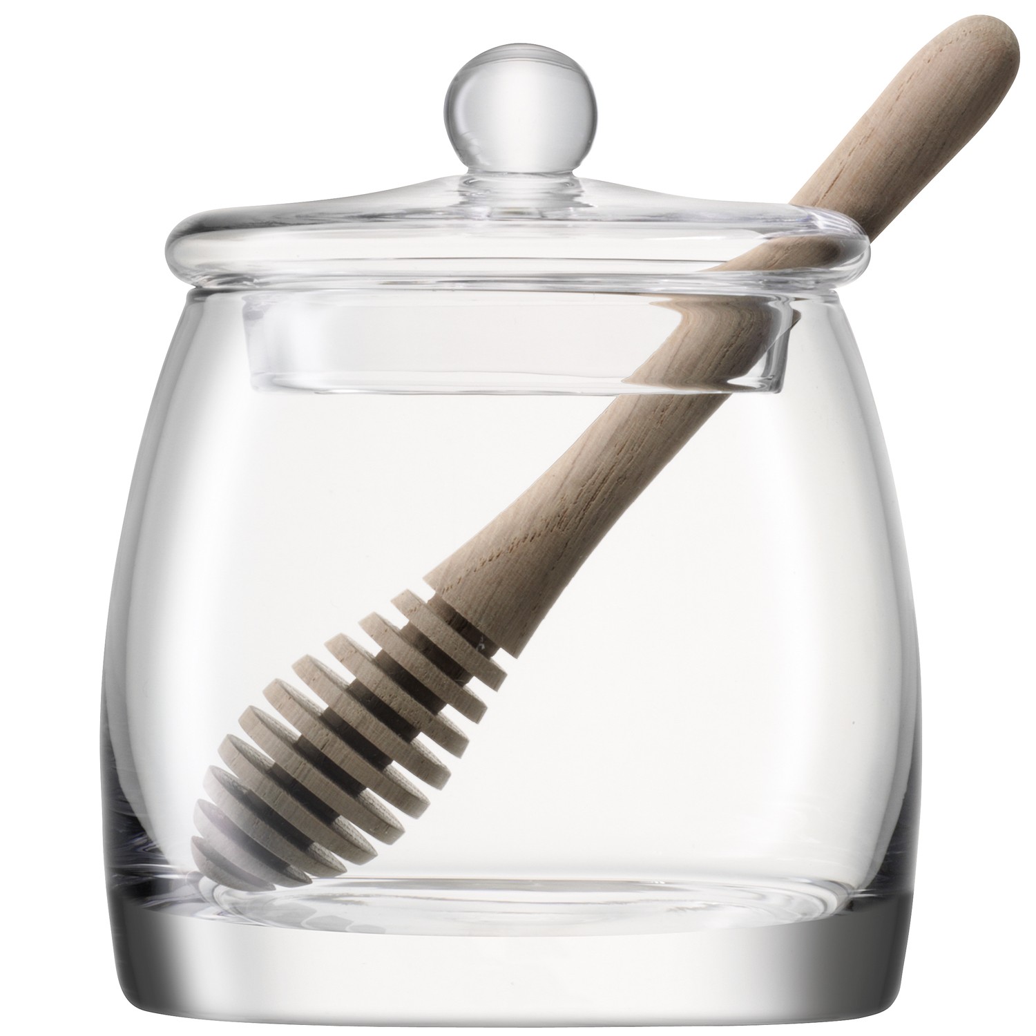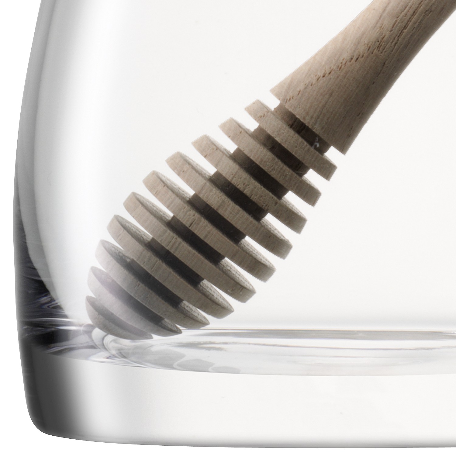 Drizzle golden honey from this mouthblown glass honeypot with its hand-finished natural oak dipper, presented in beautiful gift packaging.