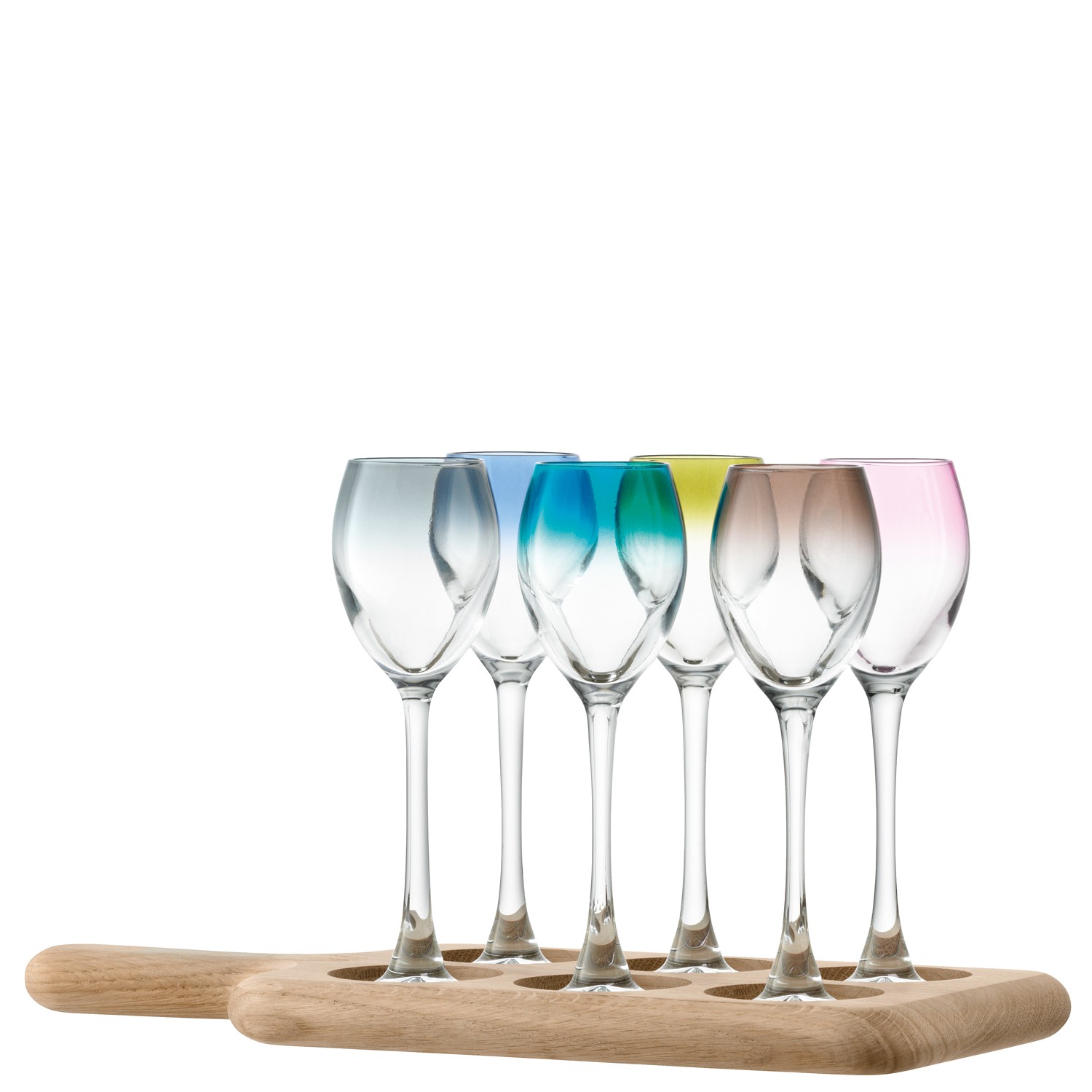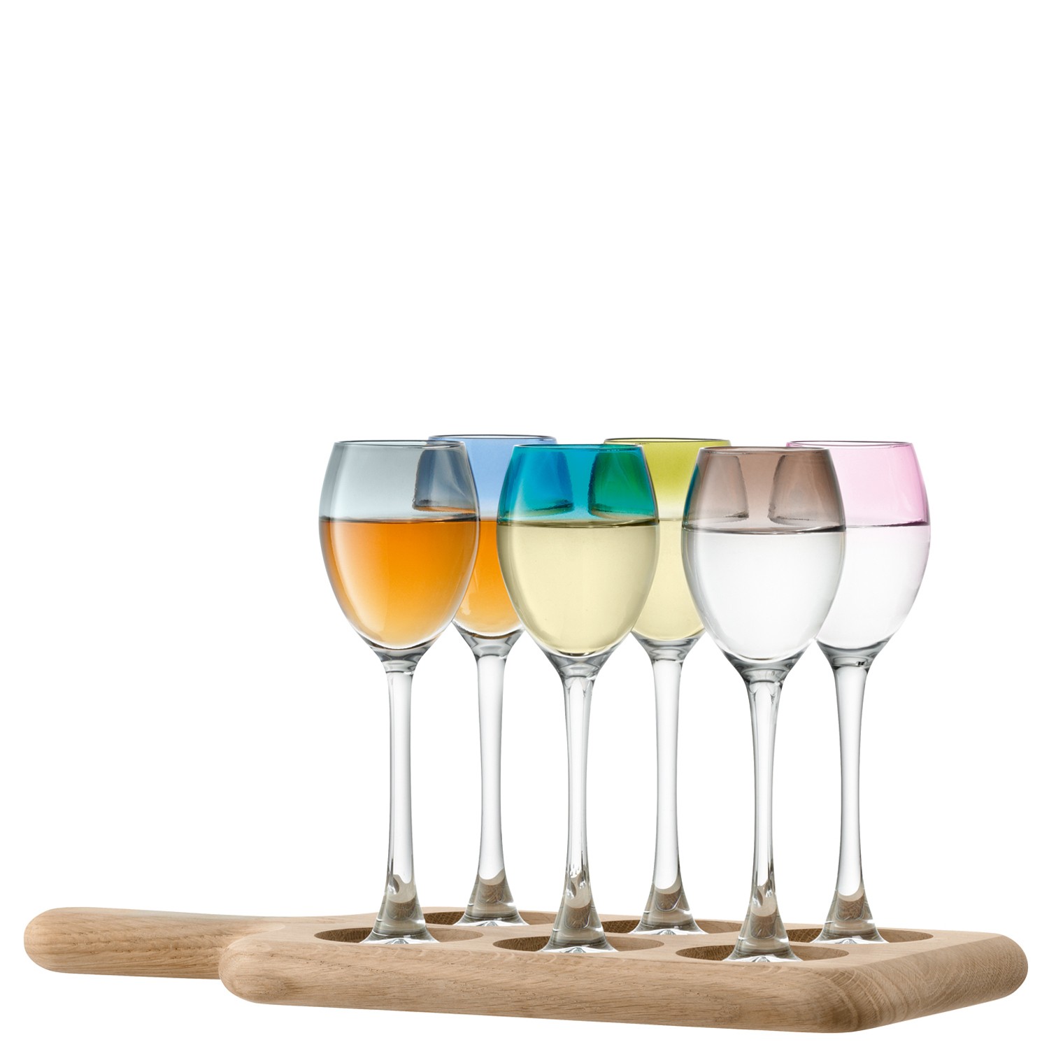 The Paddle Liqueur Set is inspired by mountain bars in the Tirol, where shots of home-brewed schnapps are offered from person to person on specially-crafted wooden trays. Hand-finished oak boards have comfortable handles for serving with ease. Specially-crafted indents securely nestle six liqueur glasses for distinctive presentation at relaxed gatherings or lively parties.