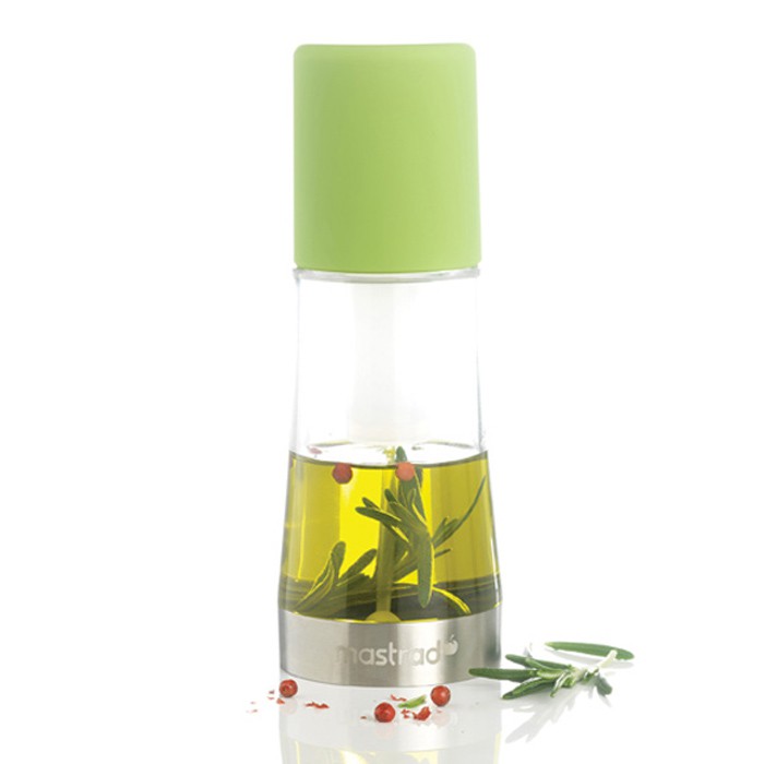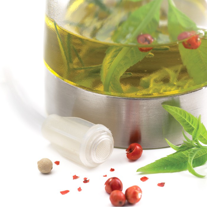The integrated filter allows to flavor oils and vinegars with spices, herbs or chillies