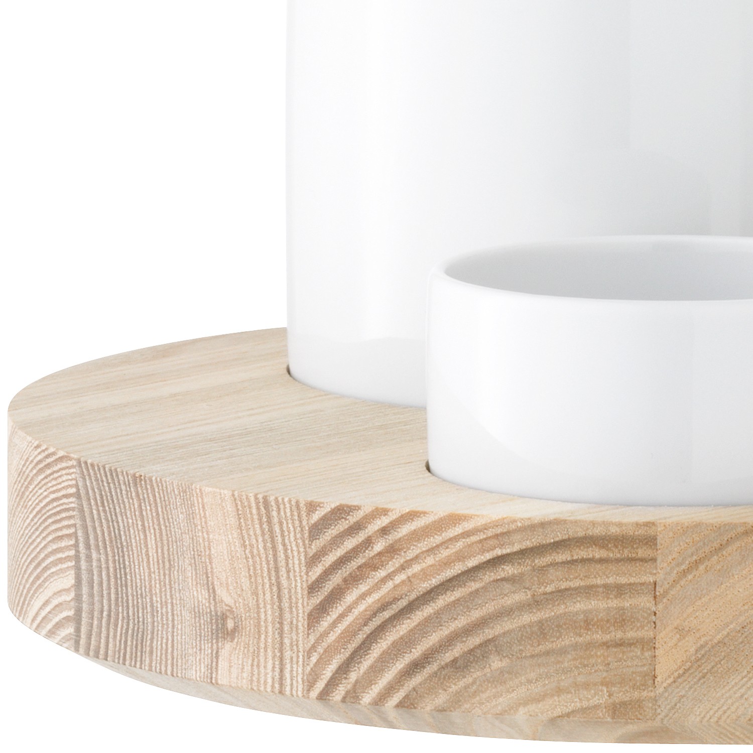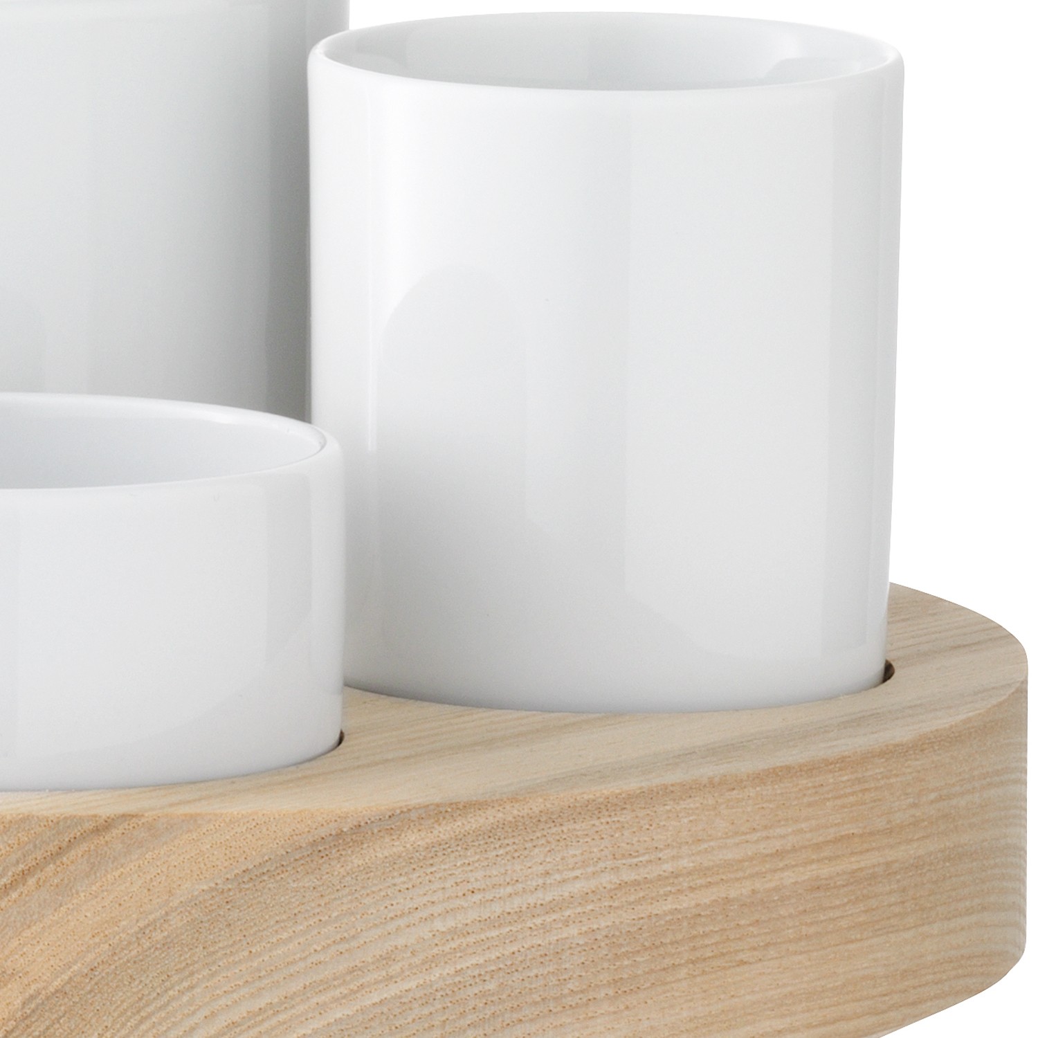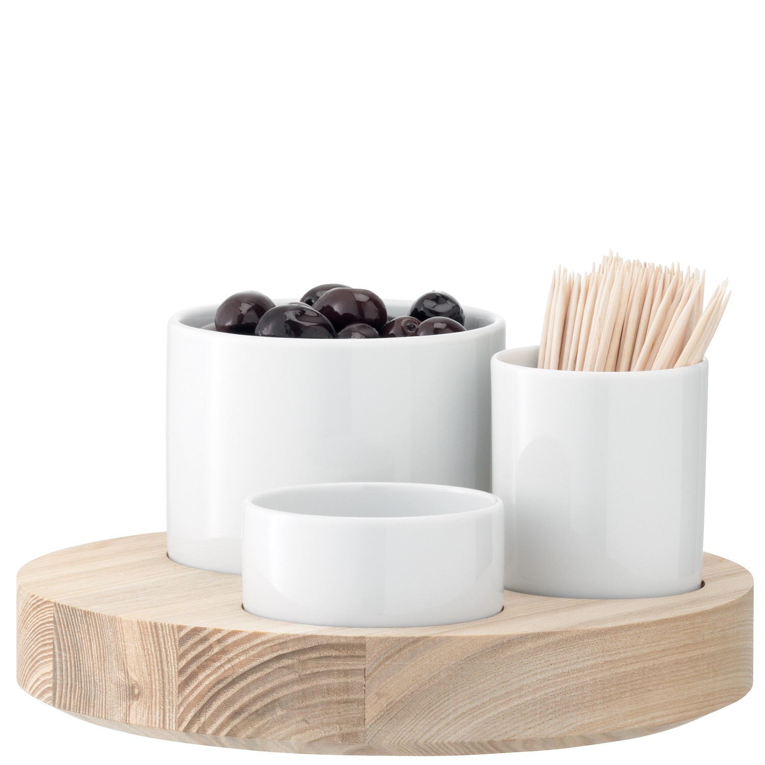 Serve a selection of hors d’oeuvres elegantly with three porcelain pots nestled in a soft-grained ash base filled perhaps with olives, bread sticks, hummus or creamy Middle Eastern aubergine dips. Luxuriously gift-boxed.
