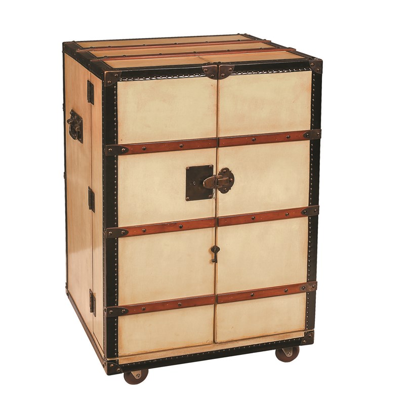 Big enough for pur-sang bartending but small enough to fit into a chic studio. Hailing from the Belle Époque. An era when armies of stewards and porters used to wheel trunks from the Wagons-Lits train to a waiting Bentley, and from the Bentley to the hold of a transatlantic steamer. Those were the days! Built in canvas-covered wood, with leather accents, bronze hardware. Varnished wood slats for protection.