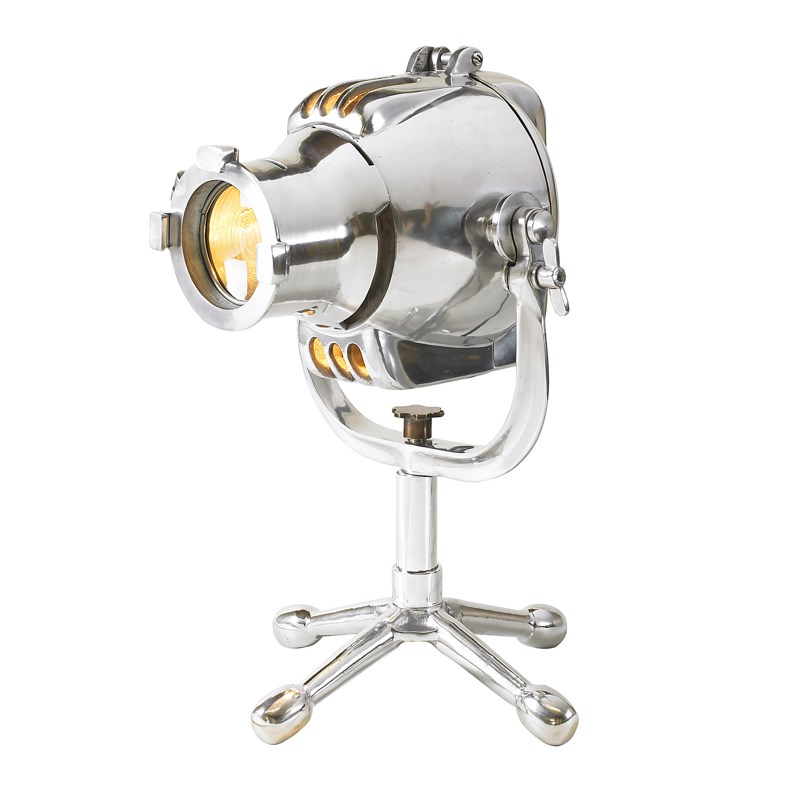 A fifties industrial looking spotlight that may have lighted the stage of the Folies Bergères or the Sadler Wells Opera House. Form follows function in this entirely practical light that condenses and magnifies a fierce beam towards the stage. Or in our case, more probably a painting or an easy club fauteuil. Handcrafted inairplane aluminum. Hand polished. Easy to adjust and point. Folding aluminum tripod. It’s all in the detail…