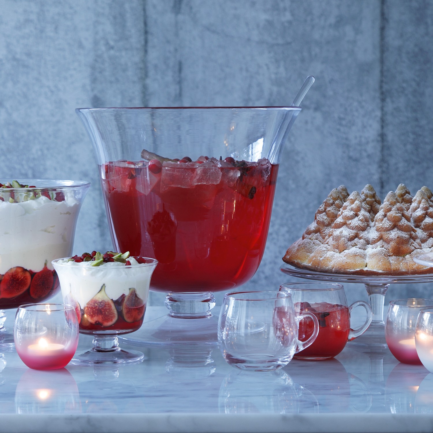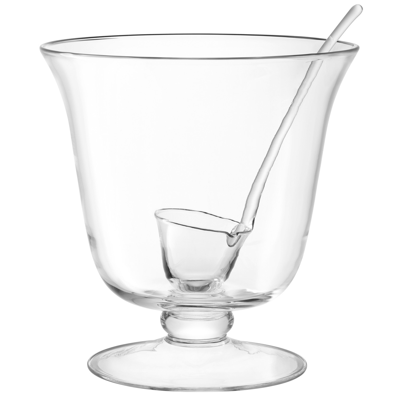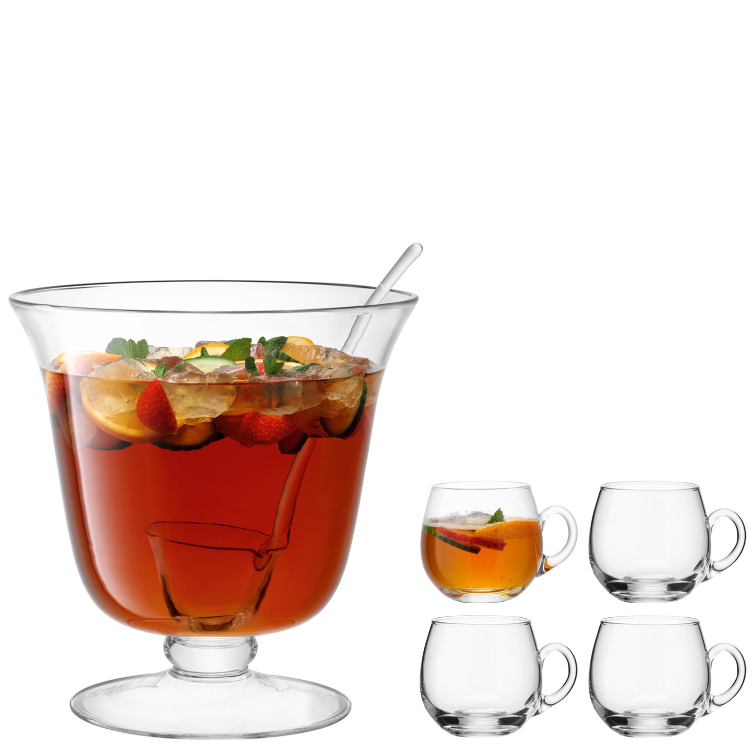 This mouthblown punch jug set is designed to enhance the pleasure entertaining at home. The generously proportioned punch bowl has an elegant footed base, while the hand-drawn ladle has a specially crafted lip for pouring with ease. Four handmade punch cups completes the set. Each punch bowl set is gift-boxed in photographic packaging.