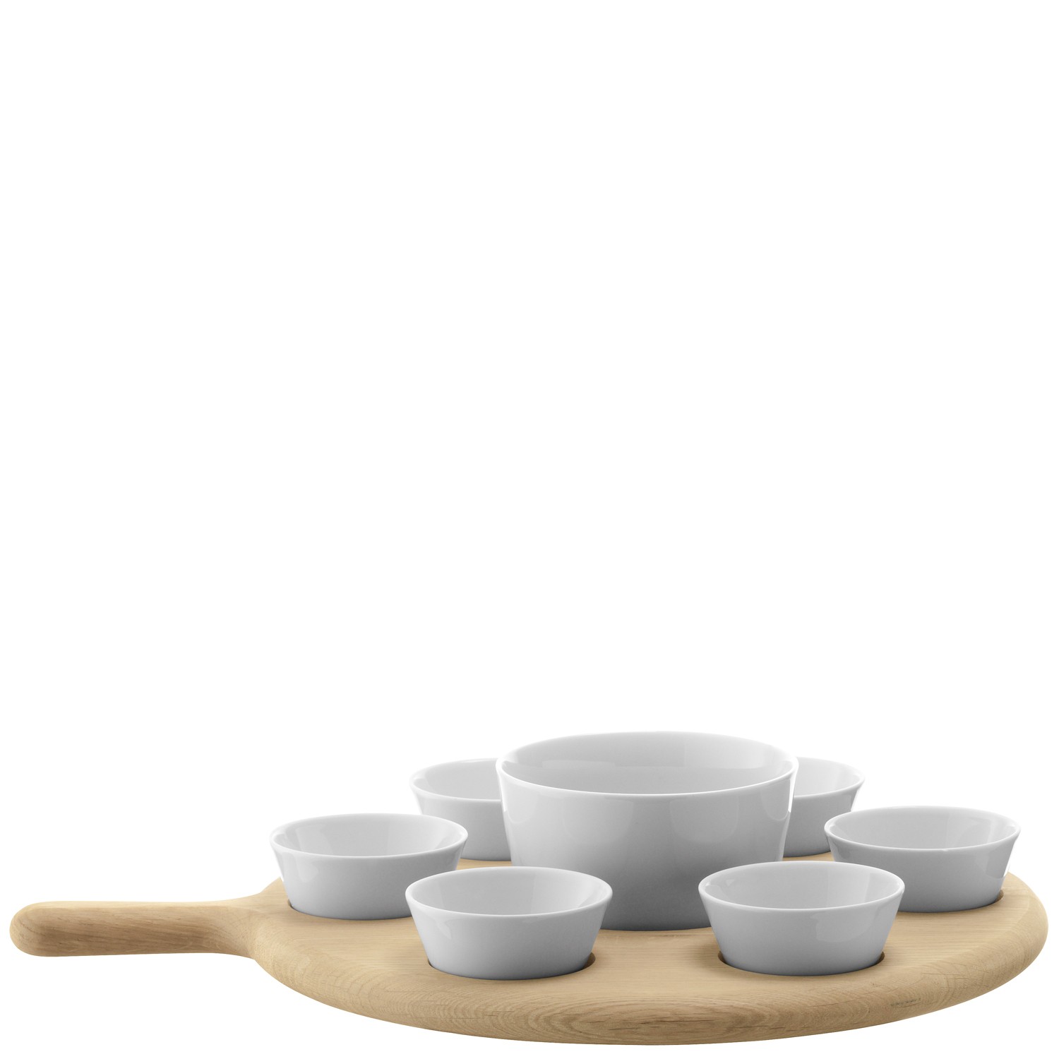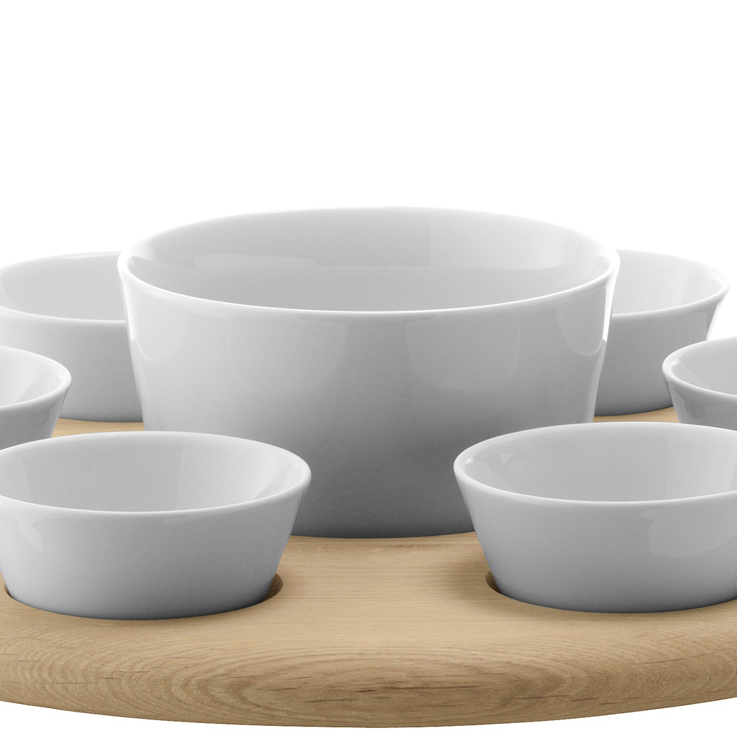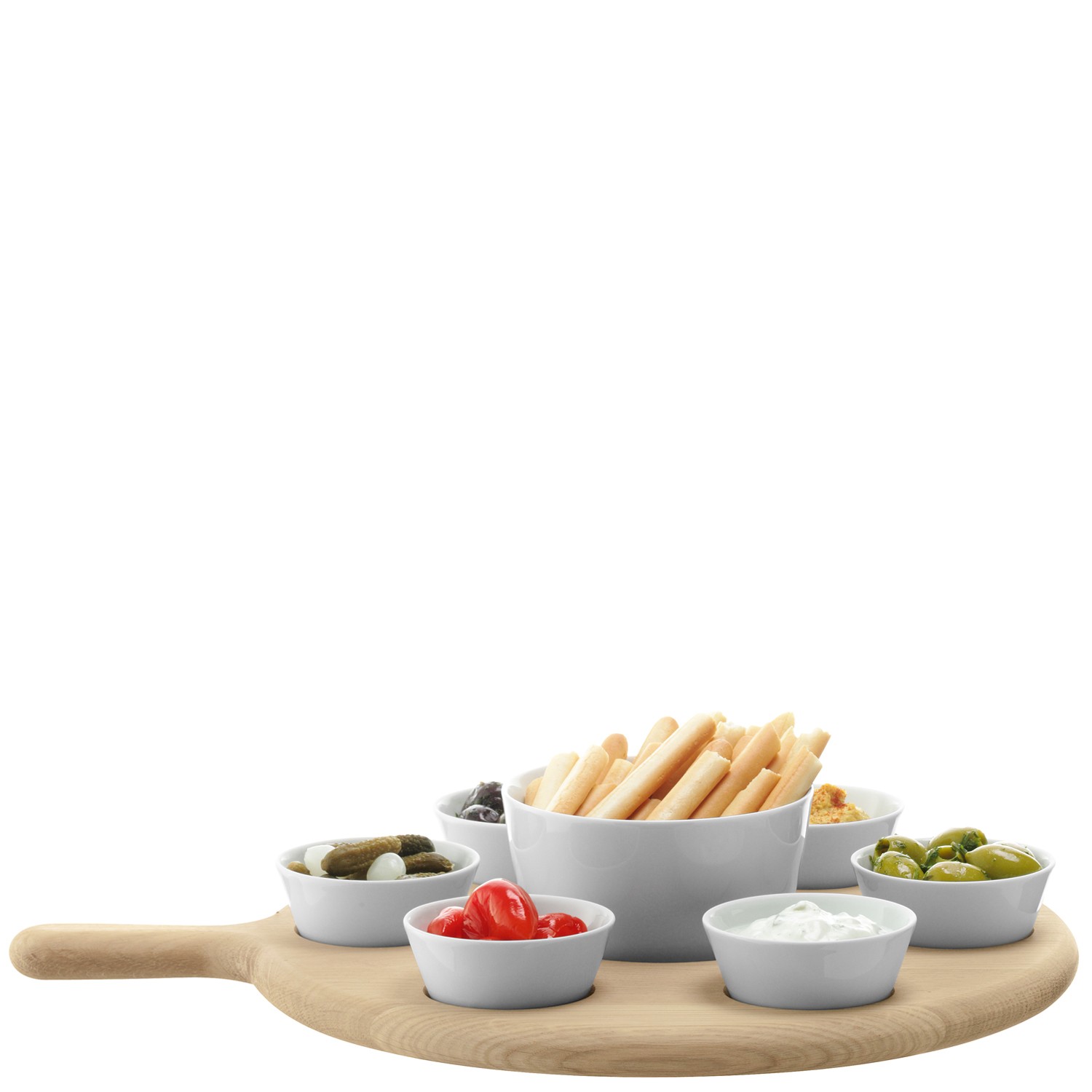 The Paddle Tapas Set is designed for serving tapas or antipasti at drinks parties or at the dinner table. Seven high-quality porcelain dishes nestle in the hand-finished natural oak board for contemporary presentation throughout the year. Presented in photographic packaging.