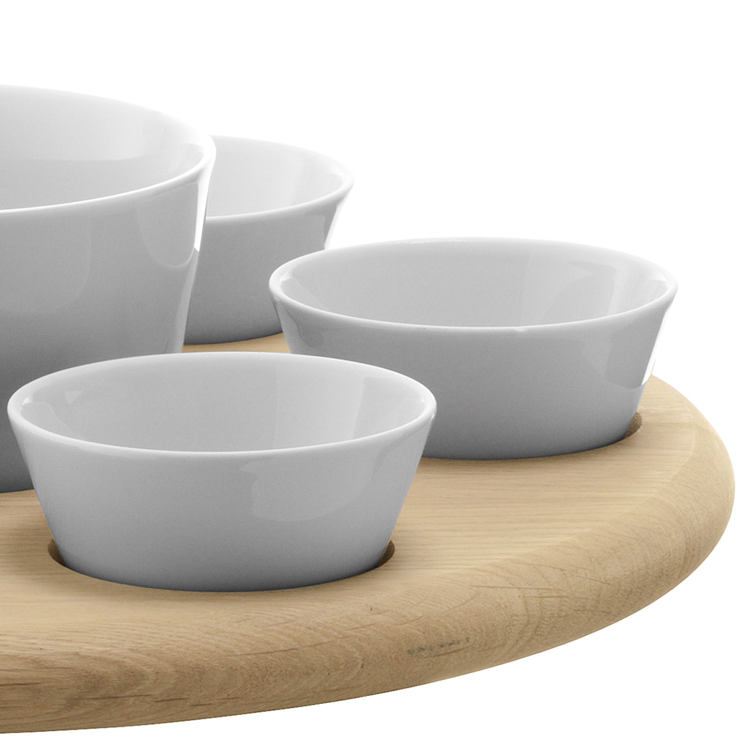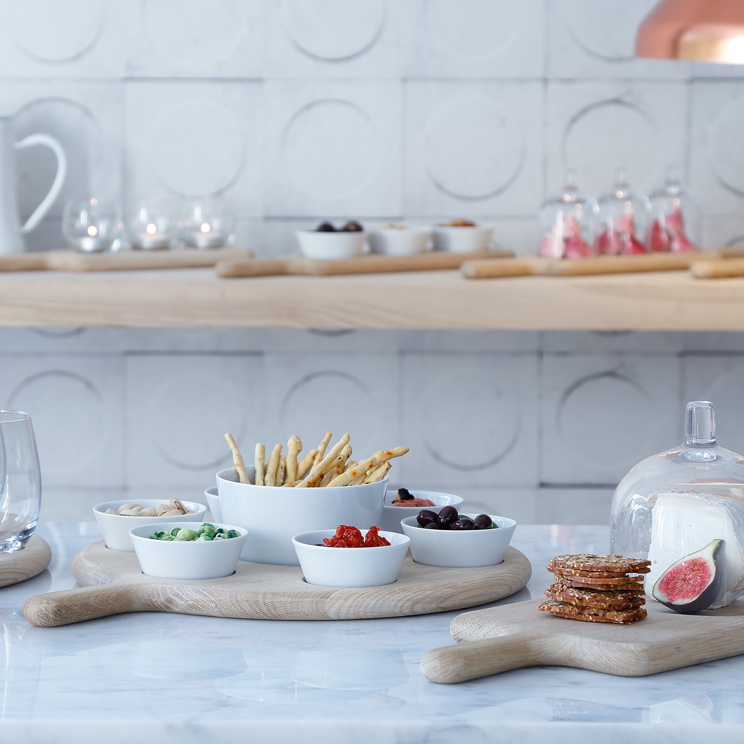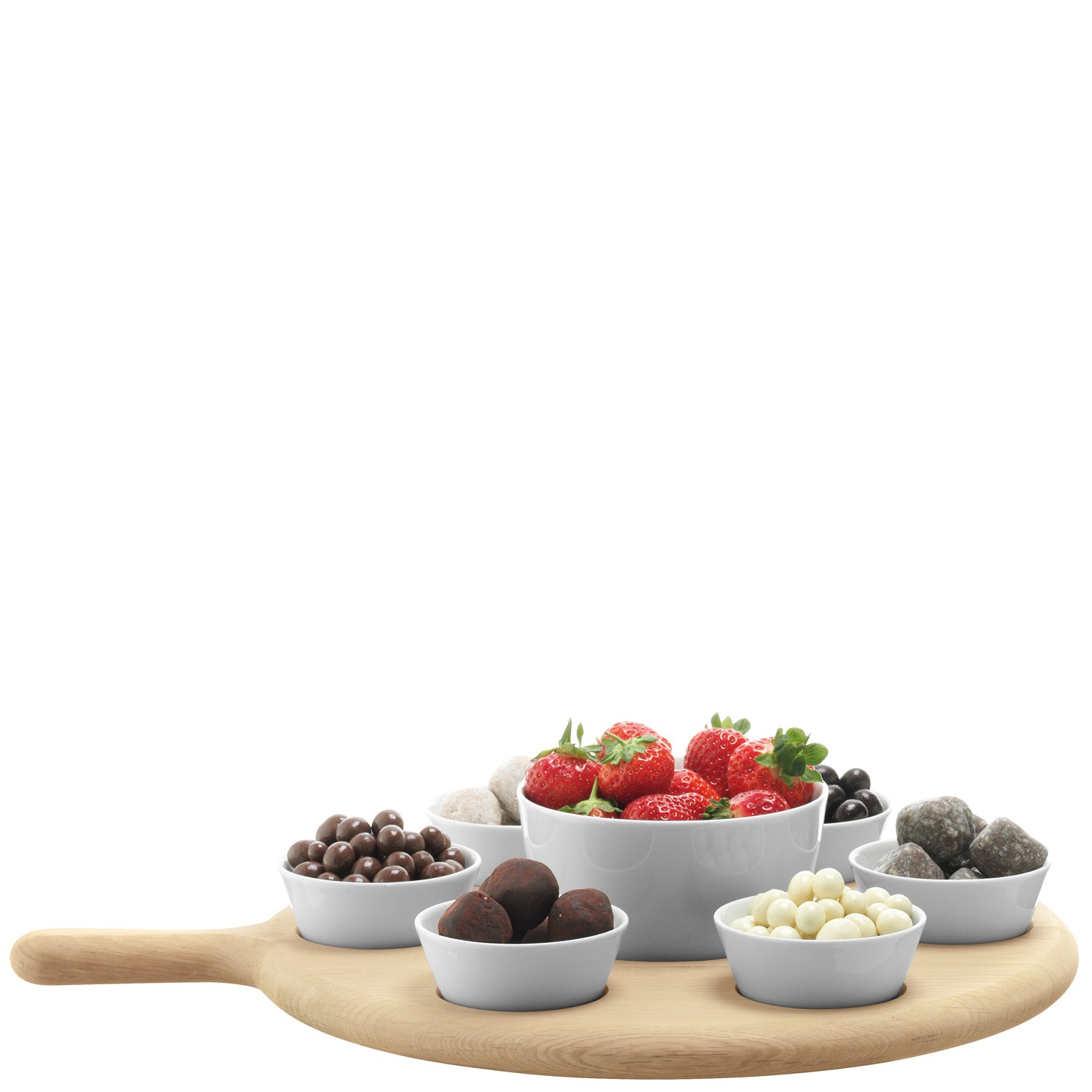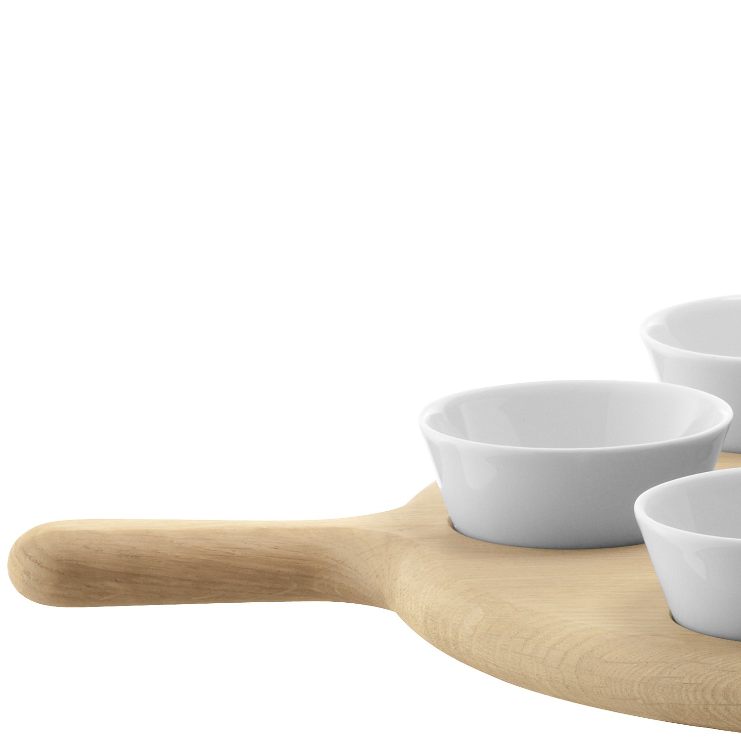 The Paddle Tapas Set is designed for serving tapas or antipasti at drinks parties or at the dinner table. Seven high-quality porcelain dishes nestle in the hand-finished natural oak board for contemporary presentation throughout the year. Presented in photographic packaging.