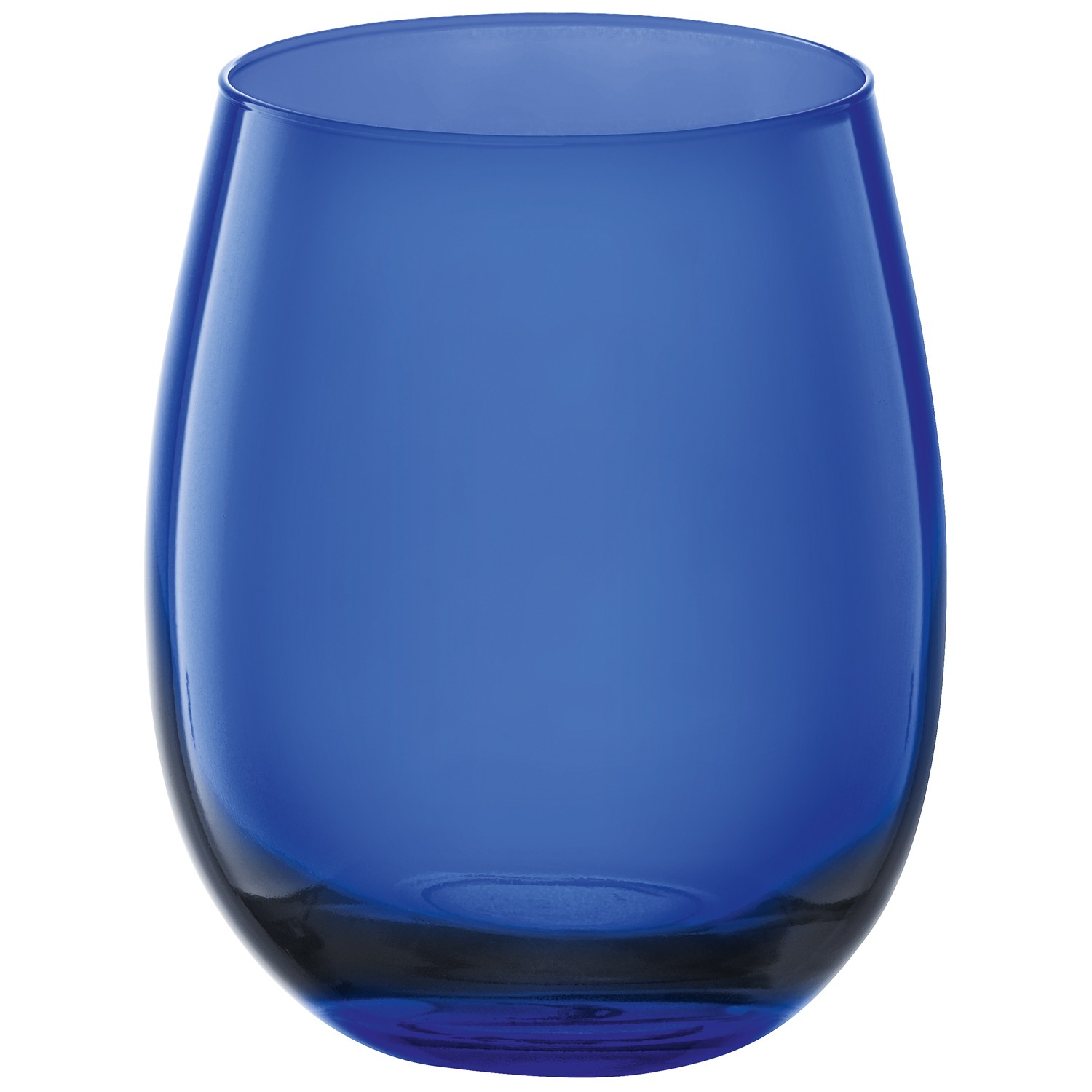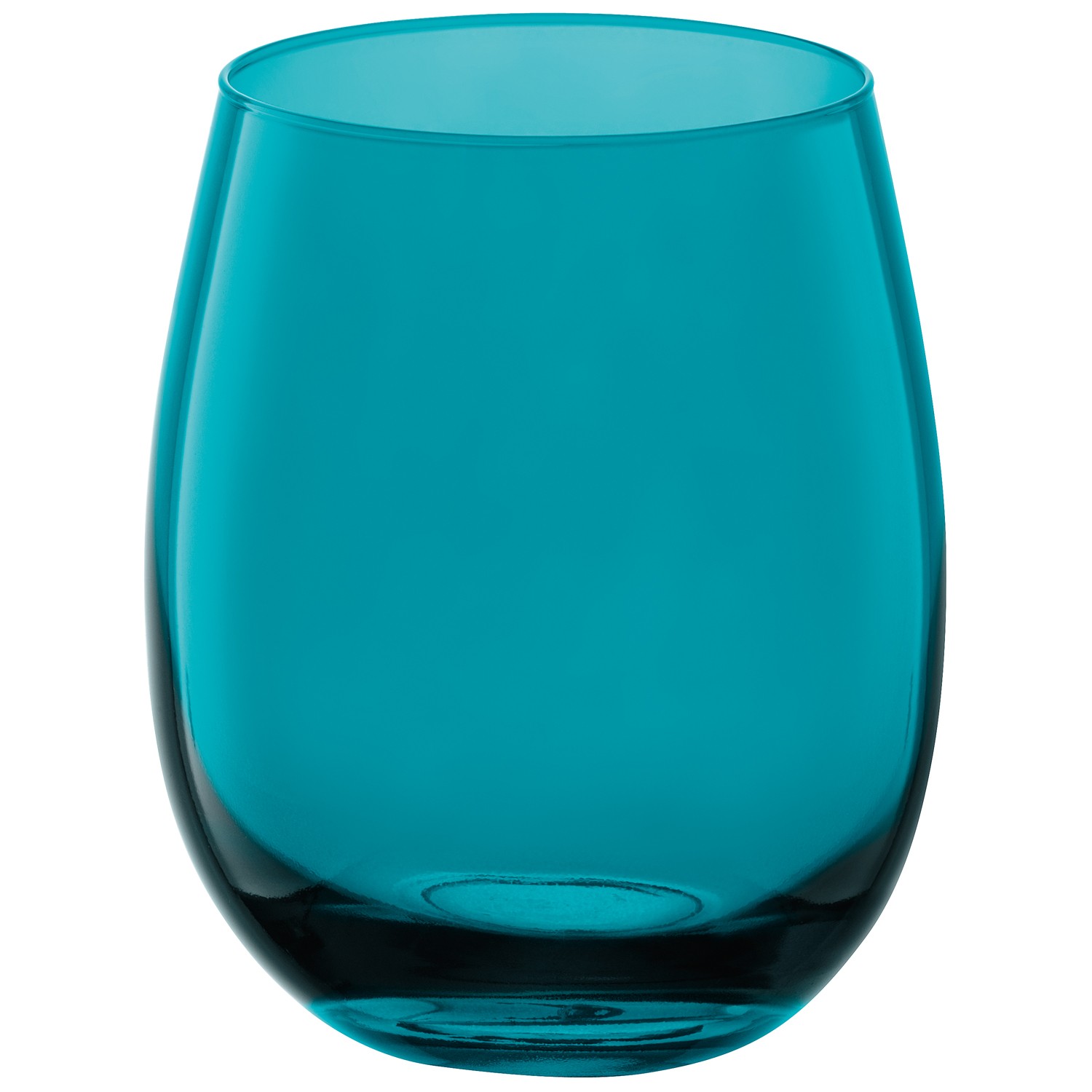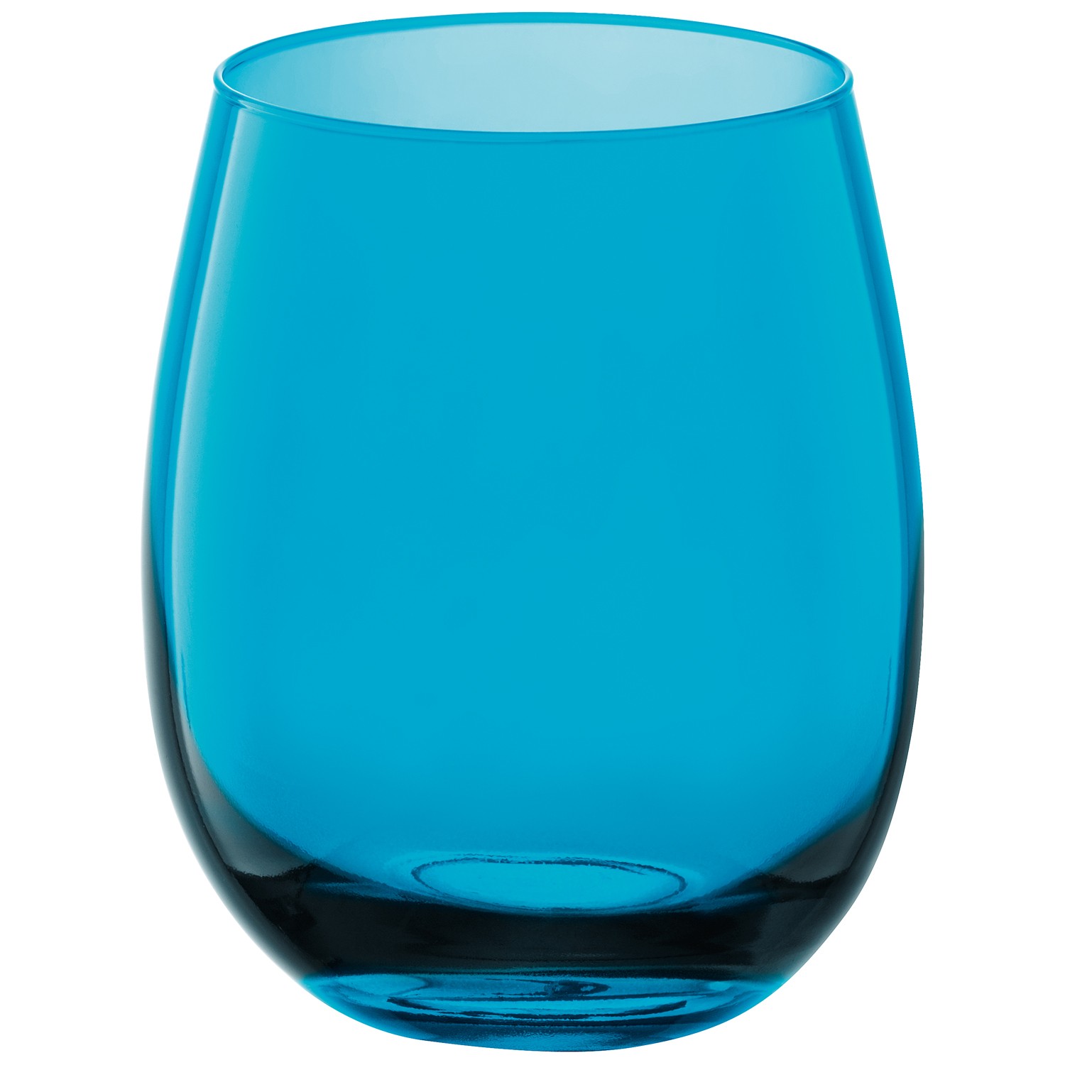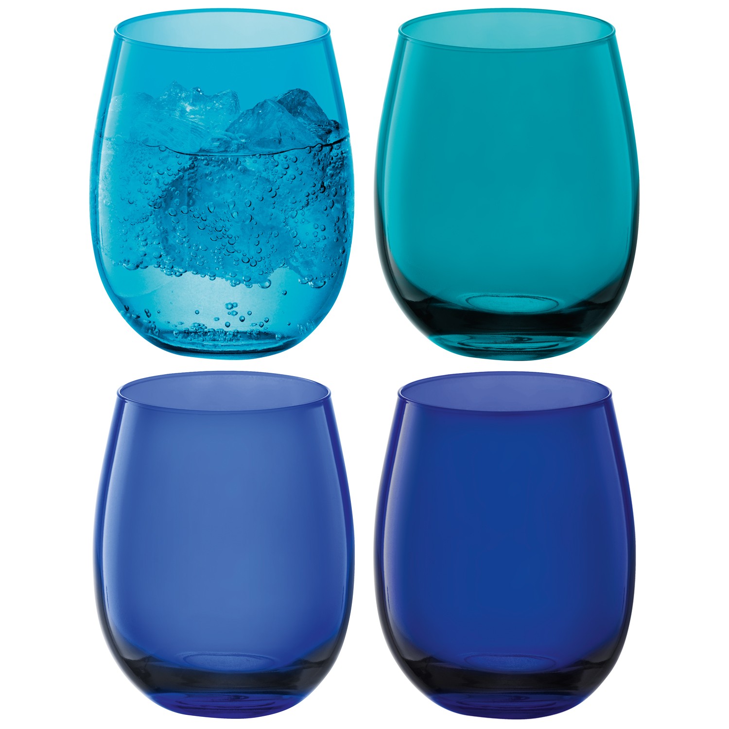 A set of stemless glasses hand decorated with four assorted lagoon blue colours. Each glass has a contemporary design suitable for serving both water and wine. Presented in a colourful gift box.